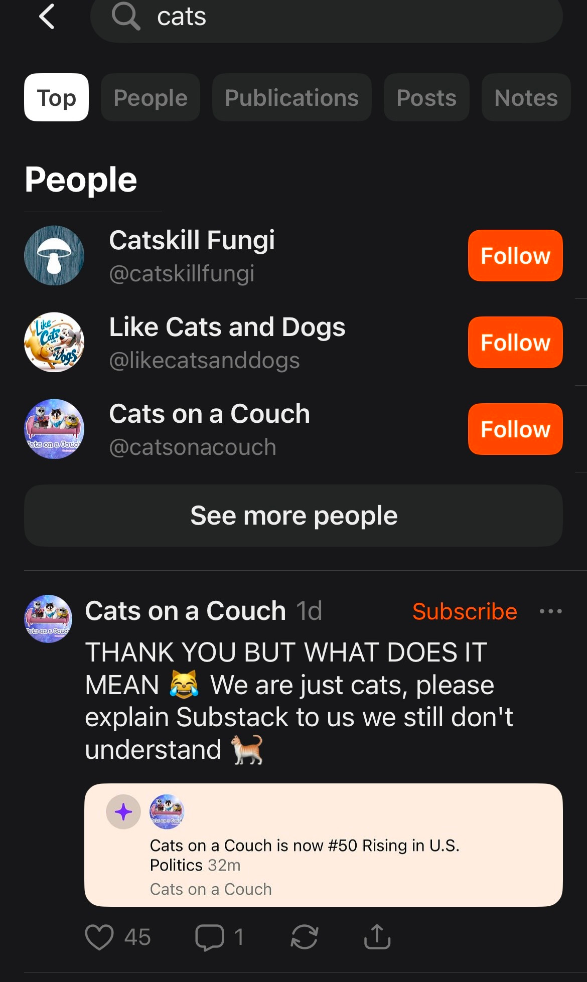 Substack is a great place to connect with creators you already know, but it’s also a place to discover new creators who share your passions and interests. If you use the “SEARCH” feature on the App and type in your favorite topic, you’ll find suggestions for people and publications to follow and subscribe to. Again, I recommend hitting “follow” if you want to see these folks and their creations in the app. But be sure to “subscribe” if you wish to receive their articles in your email inbox.